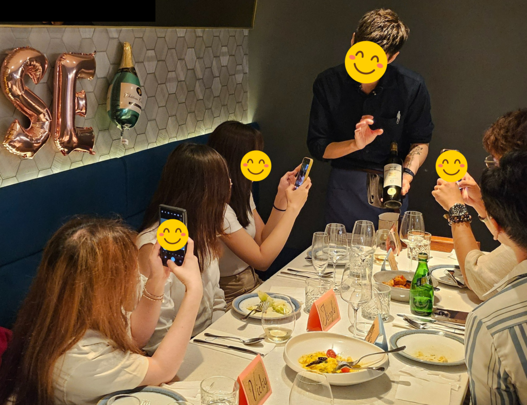 開始品酒、用餐啦~這次總共有1款氣泡酒、1款白酒、3款紅酒,由專業的侍酒師做講解、服務,讓每個人享受優質的品酒體驗,同時也開始逐一上美味餐點,在舒適的用餐氛圍中,大家也能放鬆、敞開心胸和身邊人互相開啟對話~