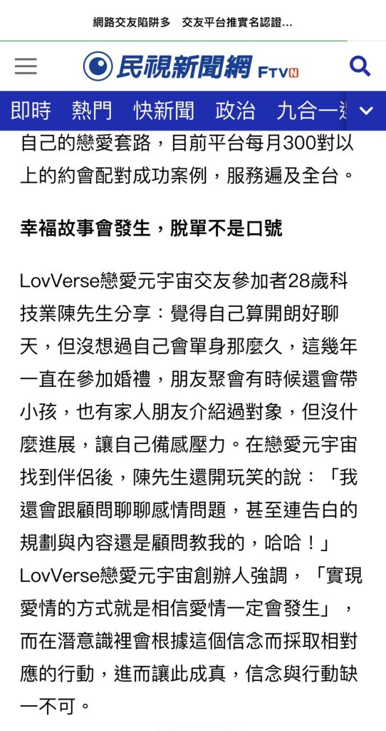 兩性專屬課程、專業配對交友、顧問諮詢服務,在戀愛元宇宙裡,和我們一起找到專屬幸福!