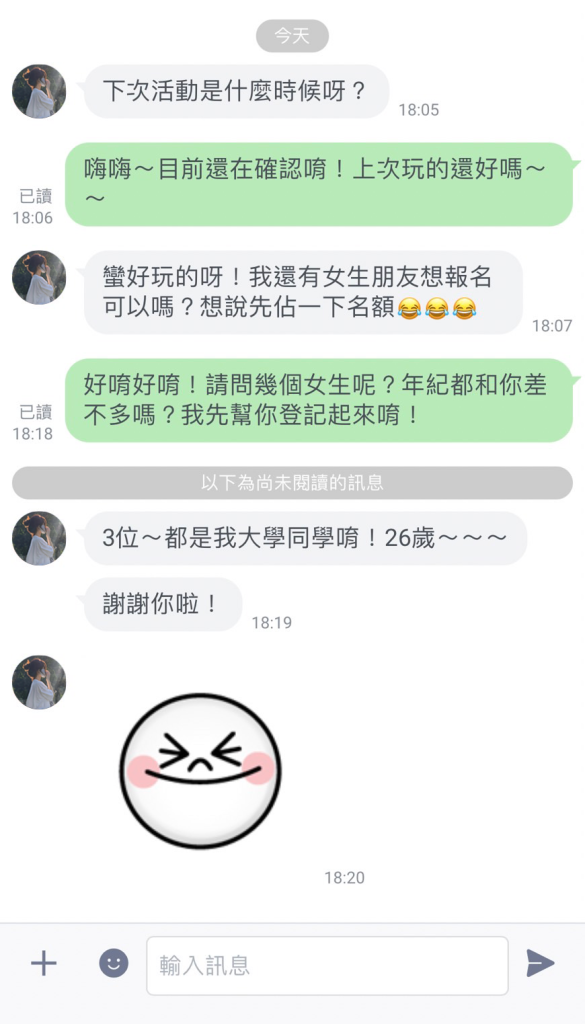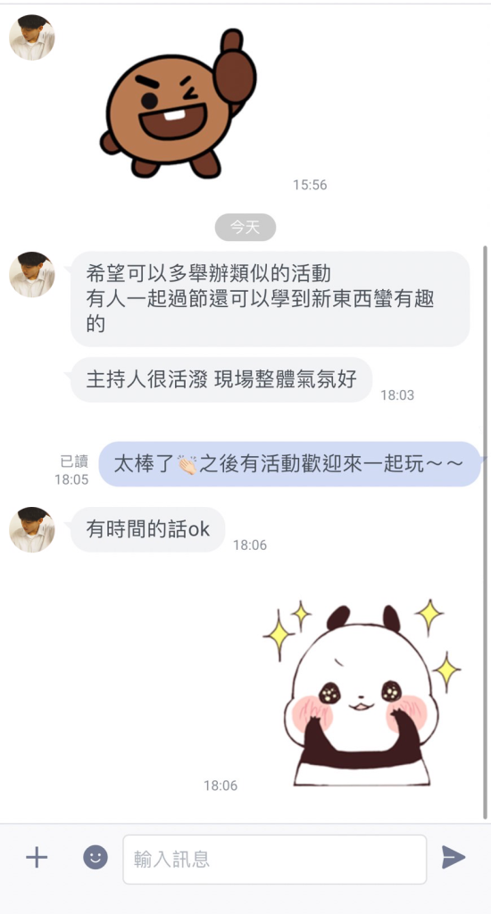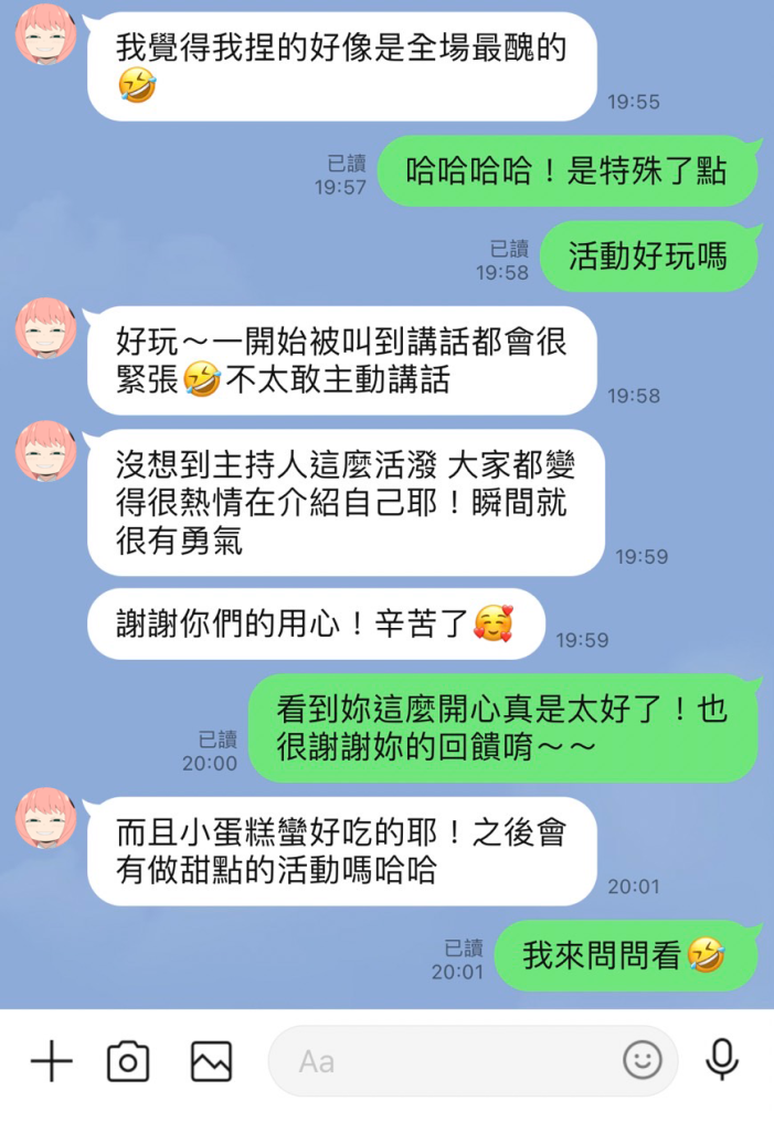 參加者Joyce: 期待下一次的活動!我還有女生朋友想報名可以嗎?想說先佔一下名額~另外若是有蠟燭的聯誼活動也可以先和我說,我和朋友們都很有興趣。