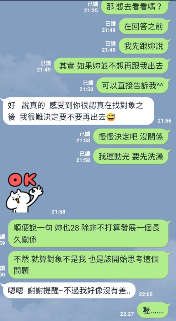 有時候我們因為對對方有好感,所以會特別去分析話中的意思,但靜下來想一下,似乎這幾句話都只是一般人的禮貌回應,總不可能第一次見面就說我覺得你人蠻討厭的、我想我們不會走在同一路、以後不要約我了,基本上只有小朋友會這樣明確的表達喜好。而這些禮貌用語不代表沒有機會,而是在告訴你:「我們還不熟,先不用想太多,等熟一點再說」。