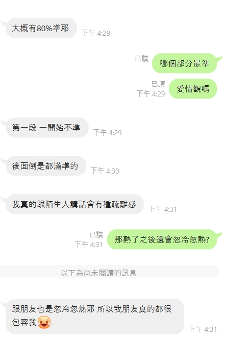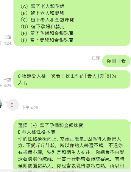 藉由時下流行的心理測驗開啟話題,甚至可直接傳連結問對方是否有玩過,並一起討論測驗結果,以增進跟對方的距離。
