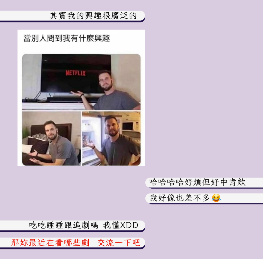 比較常見的方法是先分享自己的經驗或喜好後,再問對方,如果想讓對話顯得更有趣、更有特色,可以搭配梗圖/迷因(但要避免地獄梗)能讓氛圍更放鬆。
