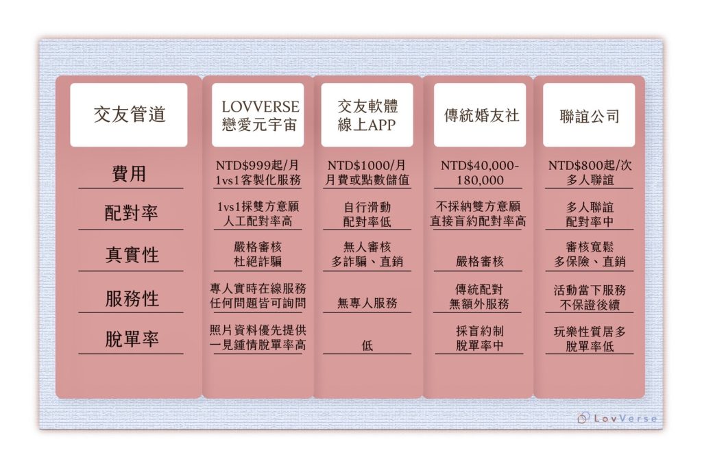 那麼大家一定會疑惑了,交友軟體、交友平台、婚友社和我們有些甚麼差別呢?以下羅列了不同的比較,開誠布公給大家,讓大家都能夠透明、公開的了解我們的優缺點,再去做詳細考量,若真心想要找到另一半共度餘生,那就讓我們一起努力吧!