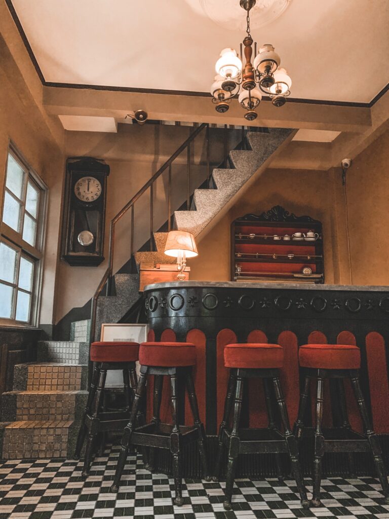 特色:隱藏在巷弄中的復古老宅.昭和日本風復古的場景,黑白相間地磚與室內裝潢呼應。